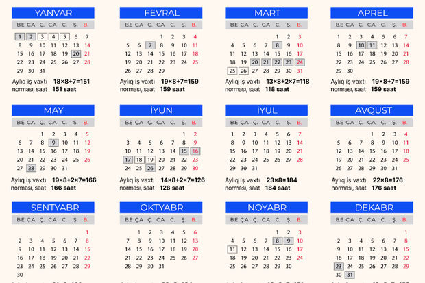 2024-cü ilin iş vaxtı norması 40 saatlıq beşgünlük iş həftəsi üzrə 8 saatlıq iş günü hesabından müəyyən edilir və bu zaman iş günü hesab edilməyən bayramqabağı, səsvermə, habelə Ümumxalq hüzn günü qabağı iş günlərində həftəlik iş günlərinin müddəti bir saat qısaldılır. 2024-cü il üçün 40 saatlıq iş həftəsində iş vaxtının illik norması 1 901 saatdır.