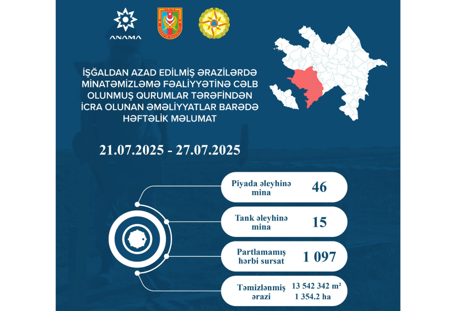 Azərbaycan Respublikasının Minatəmizləmə Agentliyi (ANAMA) işğaldan azad edilmiş ərazilərdə minatəmizləmə fəaliyyətinə cəlb olunmuş qurumlar tərəfindən 21-27 iyul tarixlərində icra edilən əməliyyatlara dair məlumat açıqlayıb.