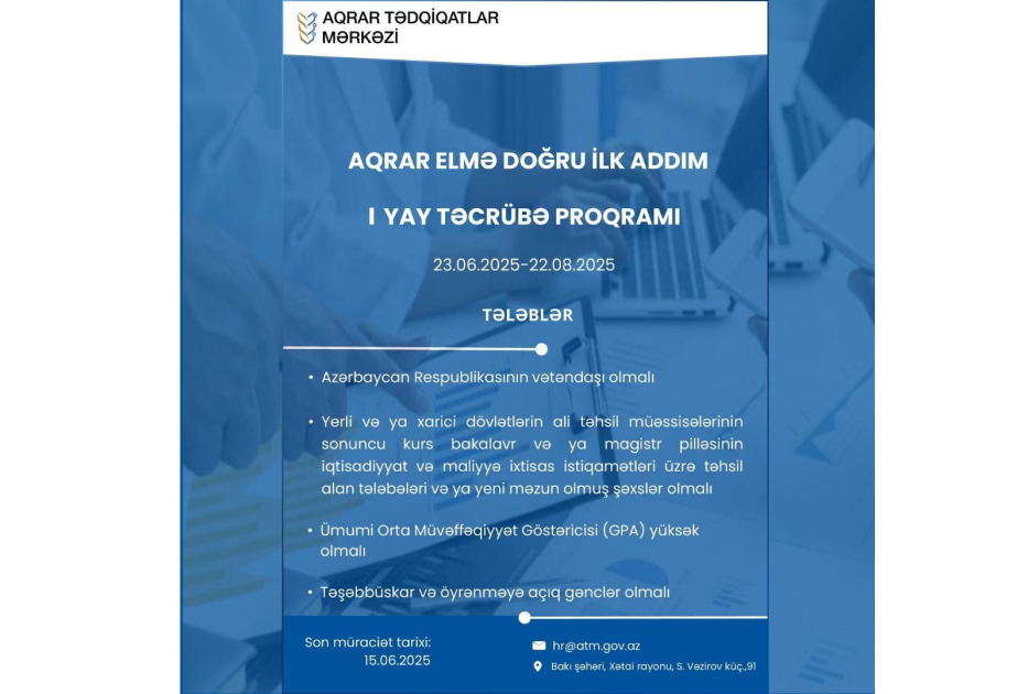 1-ci Yay Təcrübə Proqramı iyunun 23-dən avqustun 22-dək davam edəcək. İki aylıq Proqramda Azərbaycan Respublikasının vətəndaşı, yerli və ya xarici dövlətlərin ali təhsil müəssisələrinin sonuncu kurs bakalavr və ya magistr pilləsinin iqtisadiyyat və maliyyə ixtisası istiqamətləri üzrə təhsil alan tələbələri və ya yeni məzun olmuş, Ümumi Orta Müvəffəqiyyət Göstəricisi (GPA) yüksək, təşəbbüskar və öyrənməyə açıq gənclər iştirak edə bilər. Son müraciət tarixi iyunun 15-dir.