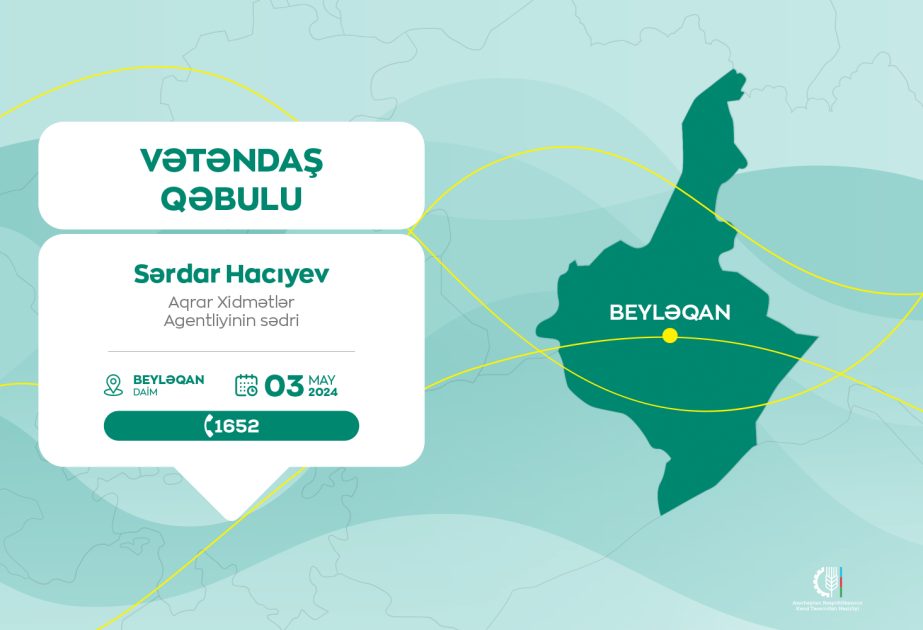 Aqrar Xidmətlər Agentliyinin sədri Sərdar Hacıyev mayın 3-də, saat 10:00-da Beyləqan Dövlət Aqrar İnkişaf Mərkəzinin inzibati binasında vətəndaşları qəbul edəcək.