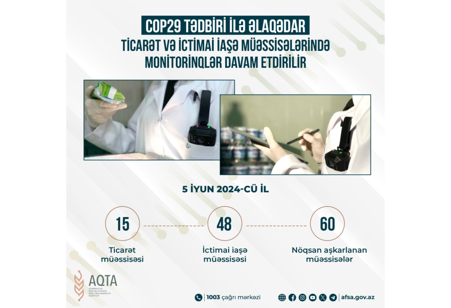 “Nəzarət tədbirləri COP29-un ölkəmizdə keçirilməsi ilə əlaqədar ölkəyə gələcək xeyli sayda xarici qonaqlara yüksək səviyyədə və təhlükəsiz qidalanma xidmətlərinin göstərilməsi məqsədilə həyata keçirilir”, – deyə AQTA-dan bildirilib.