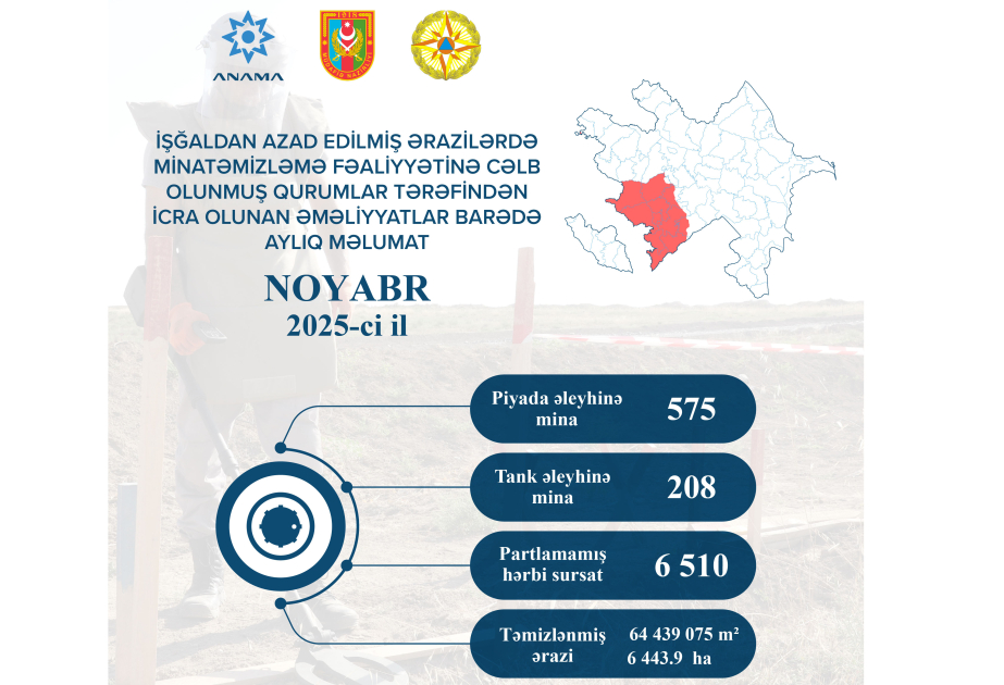 Azərbaycan Respublikasının Minatəmizləmə Agentliyi (ANAMA) işğaldan azad edilmiş ərazilərdə noyabr ayında həyata keçirilən minatəmizləmə əməliyyatları ilə bağlı məlumat yayıb.