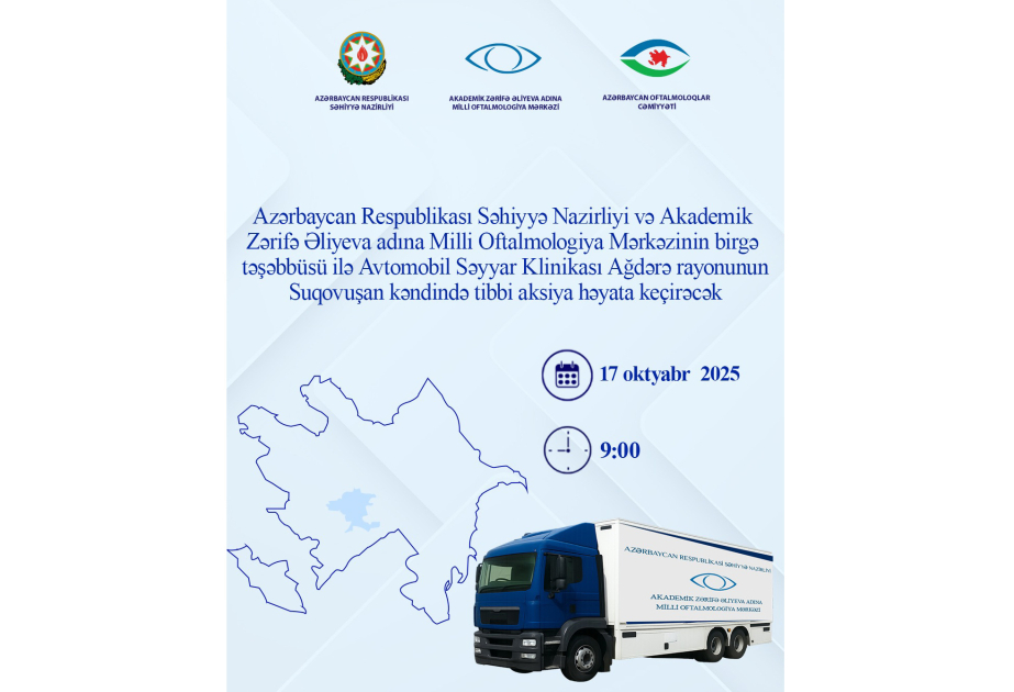 Azərbaycan Respublikası Səhiyyə Nazirliyi və Akademik Zərifə Əliyeva adına Milli Oftalmologiya Mərkəzinin birgə təşkilatçılığı ilə oktyabrın 17-də Suqovuşan kəndində Avtomobil Səyyar Klinikası tibbi aksiya keçirəcək.