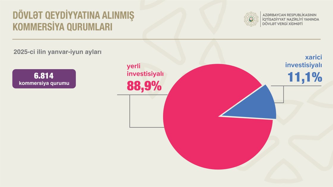 2025-ci ilin yanvar – iyun aylarında 6814 kommersiya qurumu dövlət qeydiyyatından keçib ki, onların 88,9 faizi yerli investisiyalı, 11,1 faizi xarici investisiyalıdır.