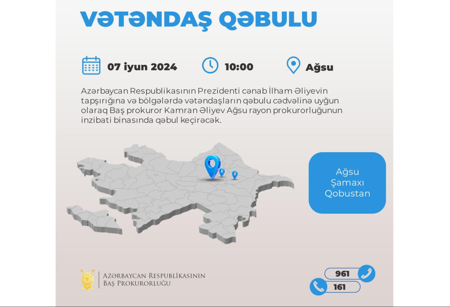 Prezident İlham Əliyevin tapşırığına və bölgələrdə vətəndaşların qəbulu cədvəlinə uyğun olaraq, Baş prokuror Kamran Əliyev iyunun 7-də saat 10:00-da Ağsu Rayon Prokurorluğunun inzibati binasında Ağsu, Şamaxı və Qobustan rayon sakinlərinin qəbulunu keçirəcək.