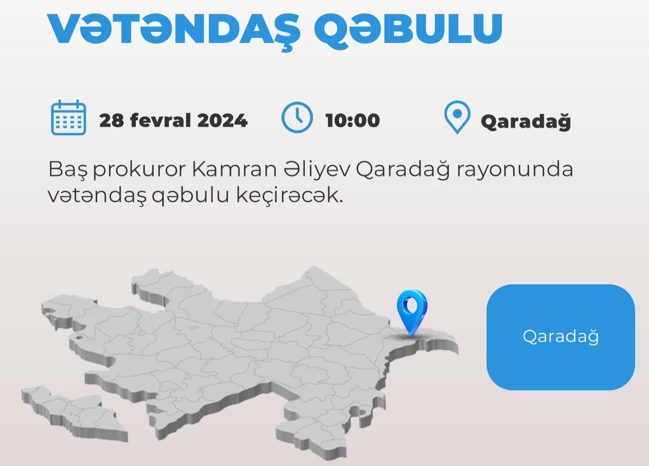 Baş Prokurorluğun mətbuat xidmətindən Doğru.az-a verilən məlumata görə, Prezident İlham Əliyevin tapşırığı və tövsiyələrinə uyğun olaraq vətəndaş məmnunluğunun və hüquqlarının qorunmasının təmin edilməsi, həmçinin bu sahədə səmərəliliyin artırılması məqsədilə Baş prokuror Kamran Əliyev fevralın 28-də saat 10:00-da Qaradağ rayon prokurorluğunun inzibati binasında rayonun hüquq-mühafizə orqanlarının icraatında olan cinayət işləri və materiallar üzrə, o cümlədən prokurorluq orqanlarının fəaliyyətinə aid məsələlərlə bağlı konkret müraciət və ya şikayəti olan vətəndaşların qəbulunu keçirəcək.