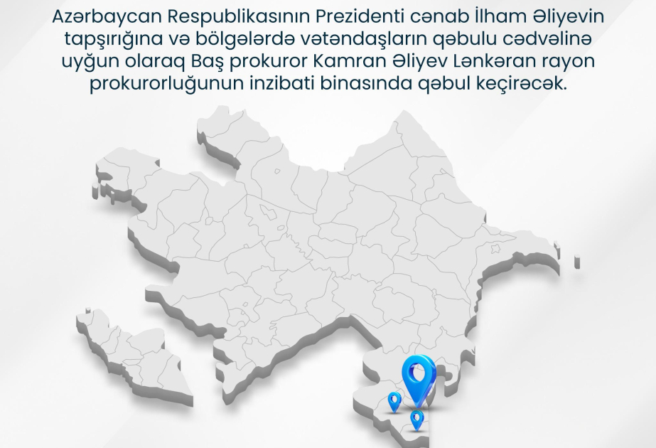 Azərbaycan Respublikasının Prezidenti İlham Əliyevin tapşırığına və bölgələrdə vətəndaşların qəbulu cədvəlinə uyğun olaraq Baş prokuror Kamran Əliyev iyunun 3-də, saat 10:00-da Lənkəran Rayon Prokurorluğunun inzibati binasında Lənkəran, Astara və Lerik rayon sakinlərinin müraciətlərini dinləyəcək.