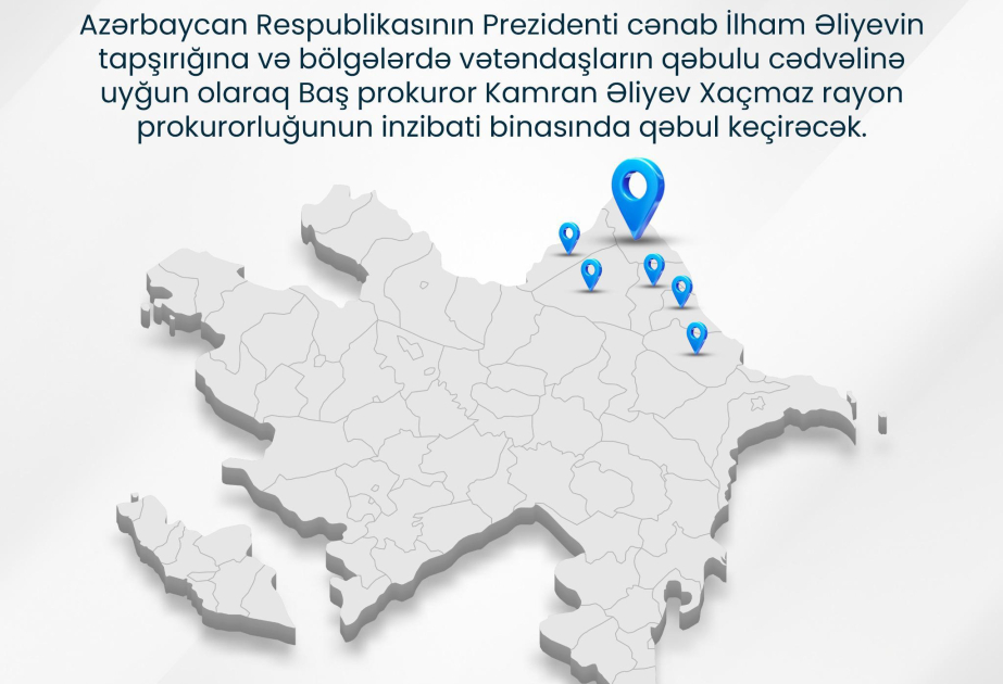 Prezident İlham Əliyevin tapşırığına və bölgələrdə vətəndaşların qəbulu qrafikinə uyğun olaraq, Baş prokuror Kamran Əliyev avqustun 15-də Xaçmaz Rayon Prokurorluğunun inzibati binasında Xaçmaz, Quba, Qusar, Şabran, Siyəzən və Xızı rayon sakinlərinin qəbulunu keçirəcək.