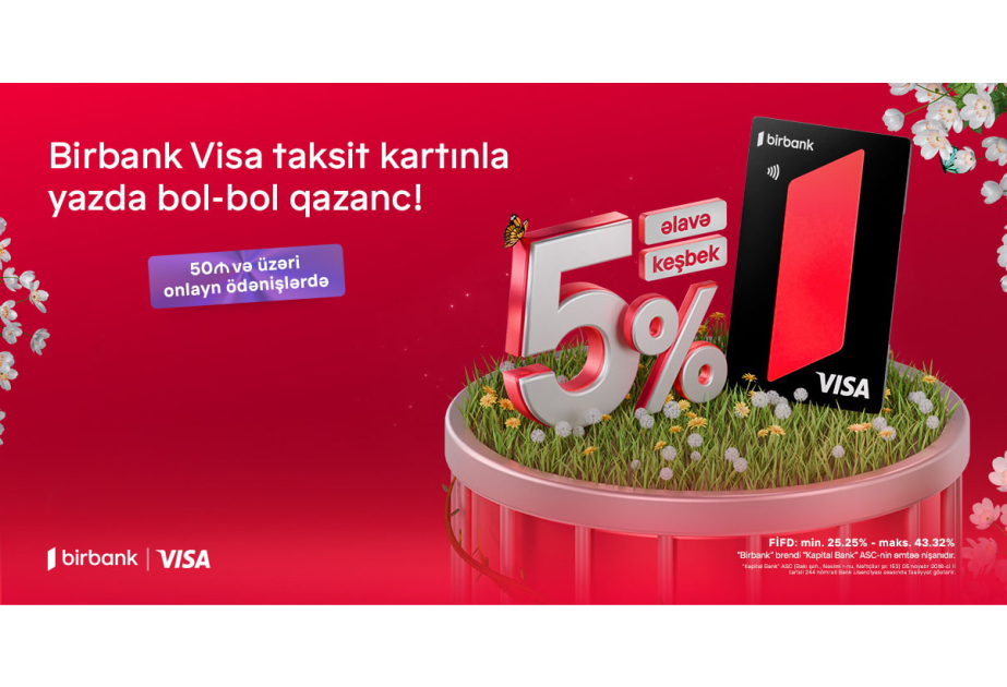 “Birbank” müştəriləri üçün yaz mövsümünə özəl kampaniya təqdim olunur. 15-29 aprel tarixlərini əhatə edən kampaniya çərçivəsində “Birbank Visa” taksit kartı sahibləri onlayn ödənişlərə əlavə keşbek qazanmaq imkanı əldə edəcəklər.