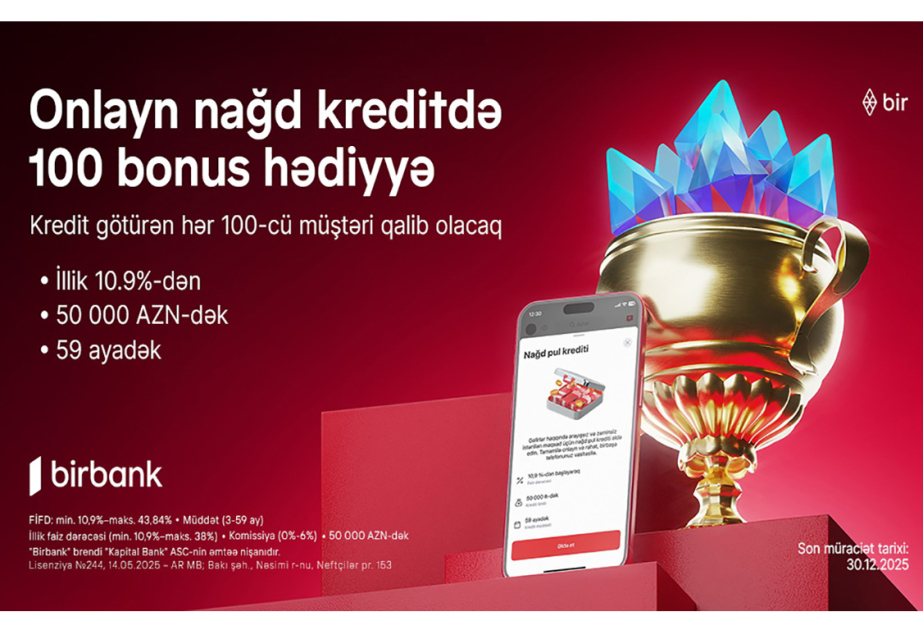 Əgər siz də məqsədinizə çatmaq üçün kredit götürmək istəyirsinizsə, xəbəriniz olsun ki, “Birbank” sizin üçün yeni kampaniyaya start verir. Belə ki, indi bankdan onlayn nağd kredit götürən hər 100-cü müştəri 100 bonus qazanır.