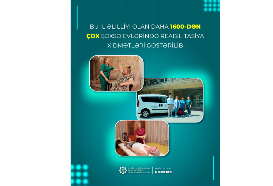 Bu ilin ötən dövründə Əmək və Əhalinin Sosial Müdafiəsi Nazirliyinin tabeliyindəki Dövlət Tibbi-Sosial Ekspertiza və Reabilitasiya Agentliyi 1 628 nəfər əlilliyi olan şəxsi evlərində (səyyar) reabilitasiya xidmətləri ilə təmin edib.