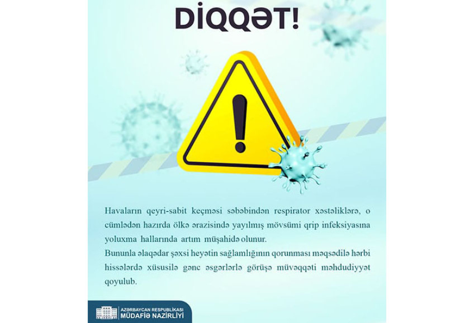 Havaların qeyri-sabit keçməsi səbəbindən respirator xəstəliklərə, o cümlədən hazırda ölkə ərazisində yayılmış mövsümi qrip infeksiyasına yoluxma hallarında artım müşahidə olunur. Bununla əlaqədar şəxsi heyətin sağlamlığının qorunması məqsədilə hərbi hissələrdə xüsusilə adaptasiya dövründə olan gənc əsgərlərlə görüşə müvəqqəti məhdudiyyət qoyulub.