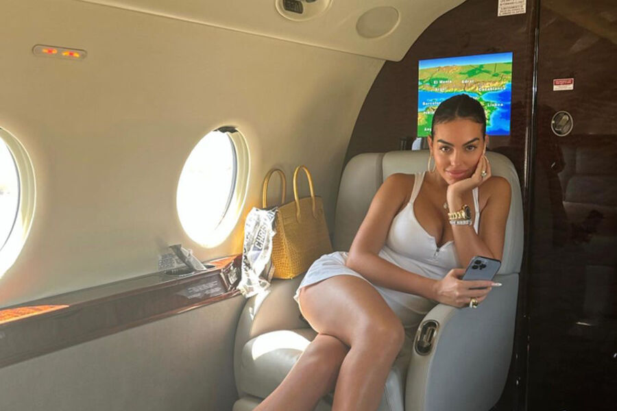 Şəkillərdə 29 yaşlı Georgina Rodriguez təyyarə oturacağında ağ tennis mini paltarı və ağ idman ayaqqabısı geyinərək poza verib. Ronaldonun gəlininin görünüşünü qızıl saat, konqo sırğaları və nəhəng qolbaq tamamlayırdı. Arxa planda modelin çantası – təxminən 80 min dollara başa gələn sürünən dərisindən hazırlanmış məhdud sayda Hermes Birkin dayanmışdı.