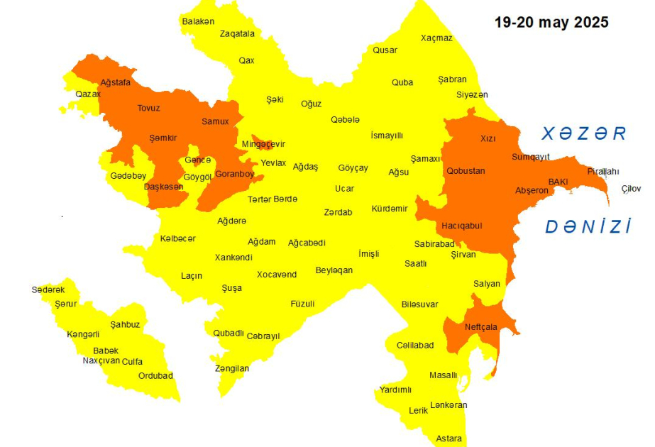 Mayın 19-u gündüz saatlarından başlayaraq 20-si səhərədək ölkə ərazisində hava şəraiti kəskin dəyişəcək. Milli Hidrometeorologiya Xidməti sarı və narıncı xəbərdarlıq yayıb.