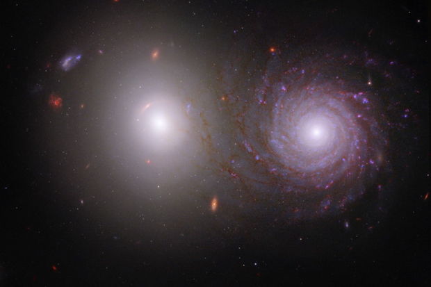 İki kosmik teleskopun çəkdiyi görüntüdə spiralvari qalaktikanın uzun, həddindən artıq tozlu qolları görünür. Belə təəssürat yaranır ki, onlar elliptik qalaktikanın mərkəzi qabarıqlığı ilə kəsişir, amma əslində, belə deyil.