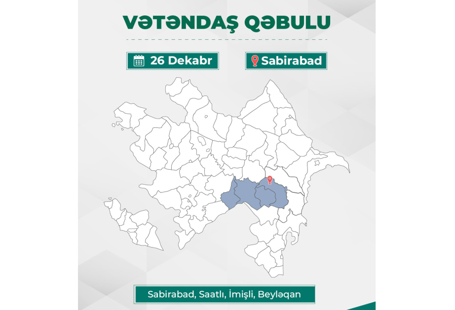 Kənd təsərrüfatı naziri Məcnun Məmmədov dekabrın 26-da saat 09:00-da Sabirabad DAİM-in inzibati binasında Sabirabad, Saatlı, İmişli və Beyləqan rayonlarından olan vətəndaşları qəbul edəcək.