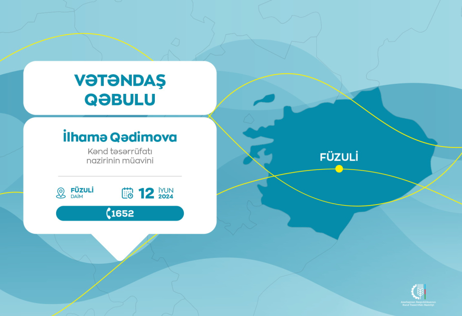 Kənd təsərrüfatı nazirinin müavini İlhamə Qədimova iyunun 12-də, saat 10:00-da Füzuli Dövlət Aqrar İnkişaf Mərkəzinin inzibati binasında vətəndaşları qəbul edəcək.