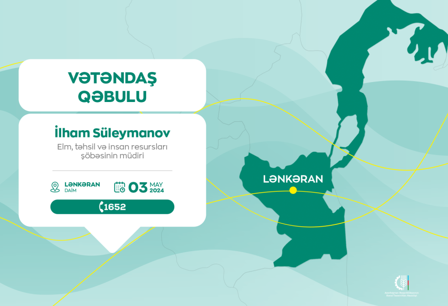 Kənd Təsərrüfatı Nazirliyinin Elm, təhsil və insan resursları şöbəsinin müdiri İlham Süleymanov mayın 3-də, saat 10:00-da Lənkəran Dövlət Aqrar İnkişaf Mərkəzinin inzibati binasında vətəndaşları qəbul edəcək.