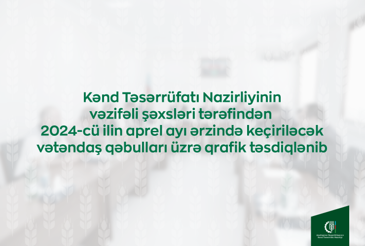 Kənd Təsərrüfatı Nazirliyinin vəzifəli şəxsləri tərəfindən 2024-cü ilin aprel ayı ərzində keçiriləcək vətəndaş qəbulları üzrə qrafiki təqdim edirik: