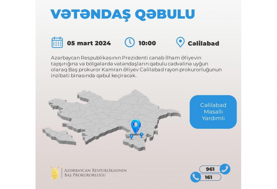 Prezident İlham Əliyevin tapşırığına və bölgələrdə vətəndaşların qəbulu cədvəlinə uyğun olaraq Baş prokuror Kamran Əliyev bu il martın 5-də saat 10:00-da Cəlilabad Rayon Prokurorluğunun inzibati binasında Cəlilabad, Masallı və Yardımlı rayon sakinlərinin qəbulunu keçirəcək.