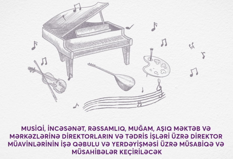 Musiqi, incəsənət, rəssamlıq, muğam, aşıq məktəb və mərkəzlərinə direktorların və tədris işləri üzrə direktor müavinlərinin işə qəbulu və yerdəyişməsi üzrə müsabiqə və müsahibələr keçiriləcək.