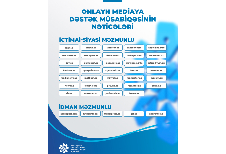 Medianın İnkişafı Agentliyi tərəfindən onlayn media subyektlərinin (veb-saytların) inkişafı, iqtisadi müstəqilliyinin gücləndirilməsi, fəaliyyətinin təkmilləşdirilməsi, həmçinin dövlət və cəmiyyət üçün əhəmiyyət kəsb edən layihələrin həyata keçirilməsi məqsədilə təşkil olunan müsabiqənin nəticələri elan edilib.