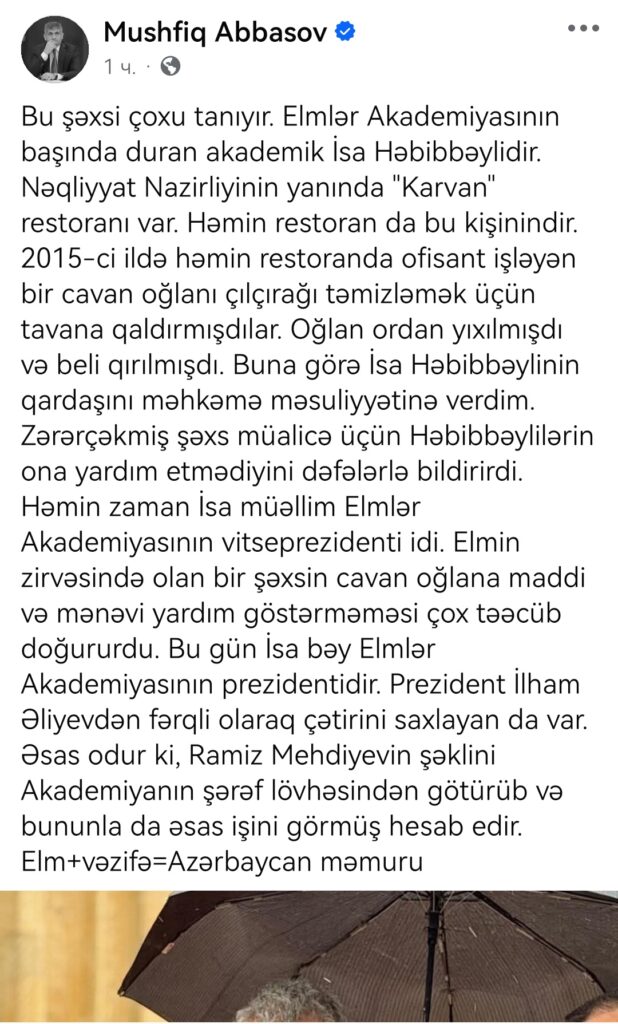 “2015-ci ildə həmin restoranda ofisant işləyən bir cavan oğlanı çılçırağı təmizləmək üçün tavana qaldırmışdılar. Oğlan ordan yıxılmışdı və beli qırılmışdı. Buna görə İsa Həbibbəylinin qardaşını məhkəmə məsuliyyətinə verdim. Zərərçəkmiş şəxs müalicə üçün Həbibbəylilərin ona yardım etmədiyini dəfələrlə bildirirdi. Həmin zaman İsa müəllim Elmlər Akademiyasının vitse prezidenti idi. Elmin zirvəsində olan bir şəxsin cavan oğlana maddi və mənəvi yardım göstərməməsi çox təəcüb doğururdu. Bu gün İsa bəy Elmlər Akademiyasının prezidentidir. Prezident İlham Əliyevdən fərqli olaraq çətirini saxlayan da var. Əsas odur ki, Ramiz Mehdiyevin şəklini Akademiyanın şərəf lövhəsindən götürüb və bununla da əsas işini görmüş hesab edir. Elm+vəzifə=Azərbaycan məmuru” – o əlavə edib.