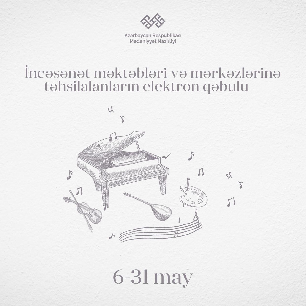 Mayın 6-da 12:00-dan start götürən qəbul prosesi “my.culture.az” vahid şəxsi kabineti vasitəsilə mayın 31-dək həyata keçiriləcək.