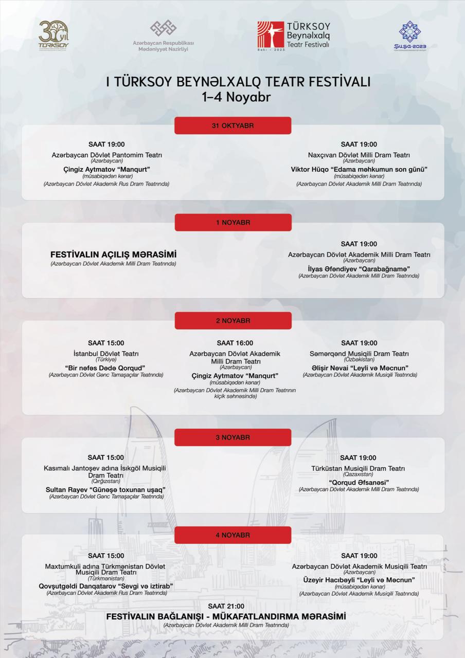 Oktyabrın 31-dən noyabrın 4-dək Şuşada və Bakıda I Beynəlxalq TÜRKSOY Teatr Festivalı keçiriləcək.