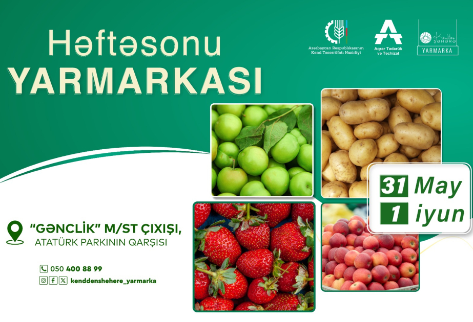 Mayın 31-dən iyunun 1-dək Kənd Təsərrüfatı Nazirliyinin tabeliyindəki “Aqrar Tədarük və Təchizat” ASC-nin təşkilatçılığı ilə paytaxtda “Kənddən Şəhərə” həftəsonu yarmarkası keçiriləcək.