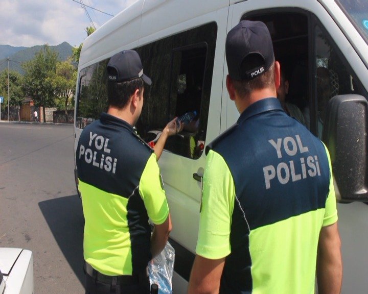 Yol polisi əməkdaşları sürücülərə və nəqliyyat vasitəsində olan sərnişinlərə sərin su paylayıb, onların səhhətləri ilə maraqlanıblar.