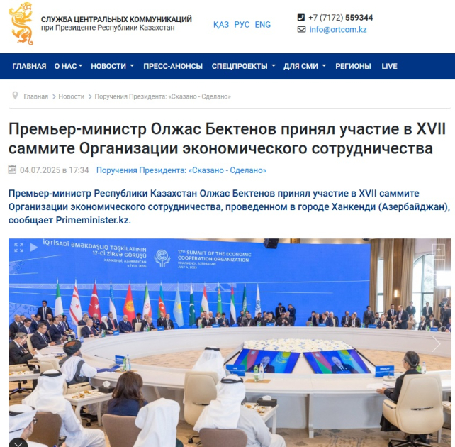 Qazaxıstan mediası Baş nazir Oljas Bektenovun İqtisadi Əməkdaşlıq Təşkilatının (ECO) 17-ci Zirvə görüşündə iştirak etmək üçün Xankəndi şəhərinə səfərini geniş işıqlandırıb.
