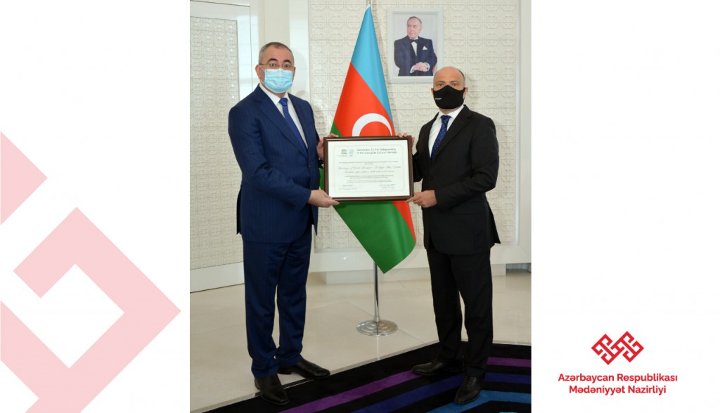 Milli Komissiyanın Baş katibi “Yallı (Köçəri, Tənzərə): Naxçıvanın ənənəvi qrup rəqsləri”, “Dədə Qorqud irsi: Dastan mədəniyyəti, xalq nağılları və musiqisi”, “Nar bayramı, ənənəvi nar festivalı və mədəniyyəti” və “Miniatür sənəti” nominasiya fayllarının Bəşəriyyətin Qeyri-maddi mədəni irsi üzrə Reprezentativ Siyahısına daxil olunduğunu təsdiqləyən sertifikatları nazir Anar Kərimova təqdim etdi.